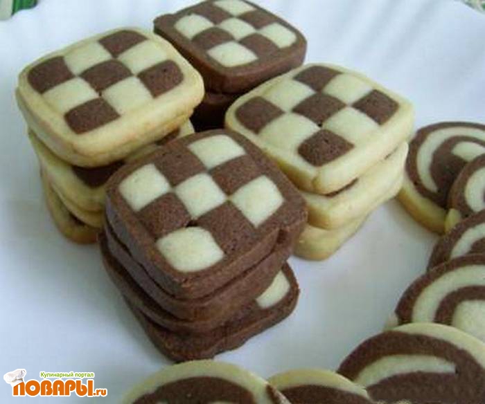 Взбить сл. масло с сахарной пудрой. Добавить яйцо и ванилин. Вмешать 2 ст. муки, и разделить тесто на 2 части. В одну из них добавить какао-порошок. Затем подмешивать муки в каждую часть до получения неприлипающего к рукам теста.