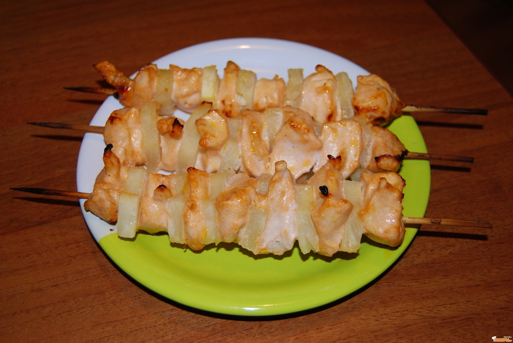 Далее берем деревянные длинные шпажки и нанизываем по очереди кусочек куриного фиде и ананасик. Все! запекаем в духовочке примерно 20 мин.
