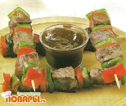 Перед подачей обжарьте шашлычки, поворачивая шпажки. Отдельно подайте соус.