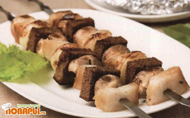 Шпик и хлеб нарежьте ломтиками, лук - кольцами. Нанижите на шампуры грибы, чередуя их с луком, шпиком и хлебом.