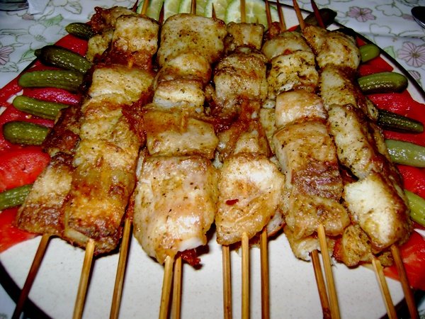рыбу, нарезать на шашлычные куски ( не мелко) посолить.