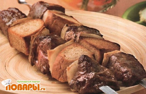 Говядину нарежьте кусками, отбейте, посолите, поперчите. Шпик и хлеб нарежьте ломтиками. Нанижите на шампуры, чередуя, хлеб, мясо и шпик. Жарьте шашлык на гриле 35 минут.