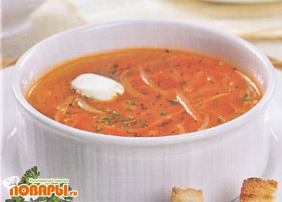 Добавьте тушеную капусту, пассерованные лук и морковь, варите до готовности. Готовые щи можно заправить растертым с солью чесноком. При подаче положите сметану, посыпьте рубленой зеленью.