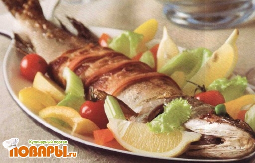 Рыбу очистите, выпотрошите, натрите солью, оберните тонкими ломтиками шпика и перевяжите нитками. Запеките рыбу над углями.