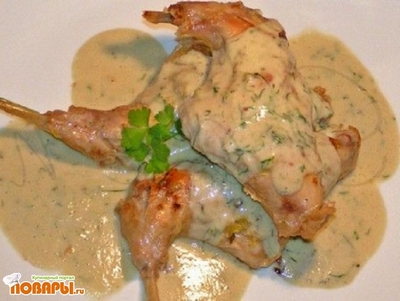 На хорошо разогретом растительном масле обжариваем мясо кролика до золотисто-румянного цвета (не обязательно до готовности). Когда получили желаемый цвет ставим на маленький огонь и добавляем 2 ст. л. соевого соуса и через минутку вино, опрыскиваем соком лимона 0,5 и добавляем лимонной цедры 0,5 - 0,7, перец чили из маринада, заливаем 200 гр. сливок и добавляем сыр "Филадельфия". Уже через несколько минут можно будет выкладывать блюдо.