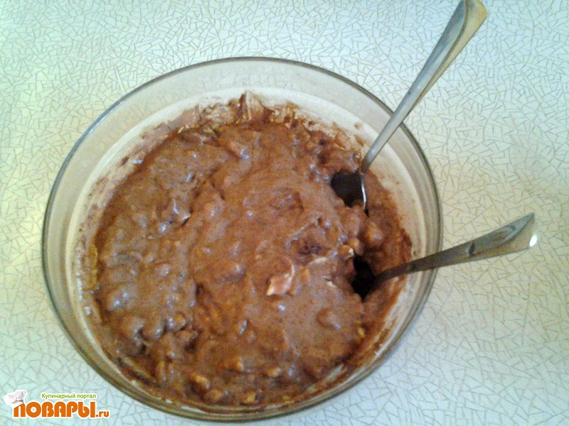 Сметану взбить вместе со всеми ингредиентами (орехи и печенье растолочить на маленькие кусочки).