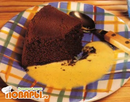 Налейте на дно тарелки немного ванильного английского крема и положите на него кусок шоколадного пирога. При желании можно добавить к этой композиции шарик ванильного мороженого.