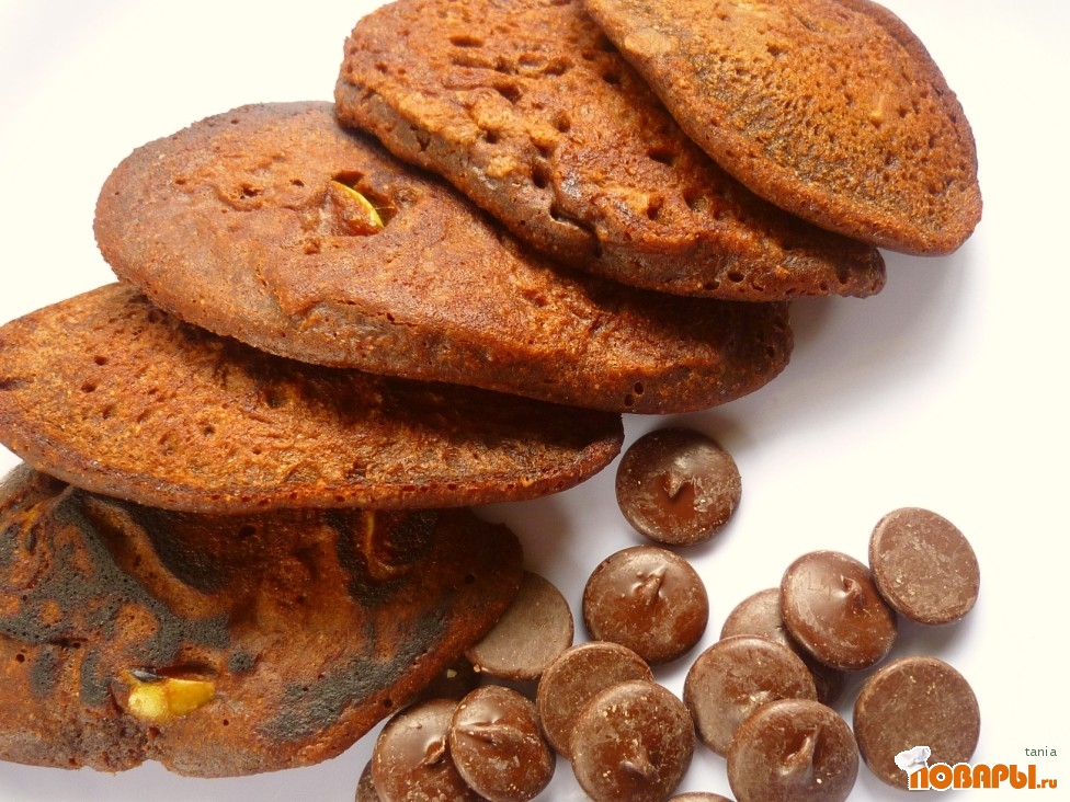В сухой смеси сделать посередине воронку, влить туда все жидкие ингредиенты, т. е. шоколадную смесь, молоко, ваниль. Хорошо вымешать, если очень густо, то добавить молока. Добавить яблоки, вымешать. Поджарить небольшие оладушки на горячей сковородке.