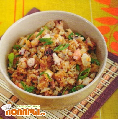Всыпать в сковороду рис, влить соевый соус, перемешать до однородности.