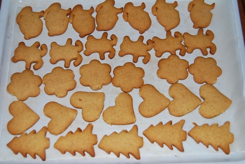 Взбиваем яйца, добавляем сахар и еще взбиваем. Вливаем растопленное масло и мед. Перемешиваем и добавляем 1 чайную ложку(без горки) соды гашеную уксусом. Добавляем чуток ванилина и муку. Замешиваем тесто, оно должно быть мягким. Вырезаем различные фигурки формочками.