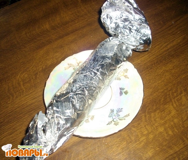Руками формируем сначала шар из сладкой массы, а потом скручиваем колбаску и заворачиваем ее в фольгу в виде большой конфеты. Чтобы масса не липла к рукам, смочите их водой. Убираем до полного остывания в холодильник.