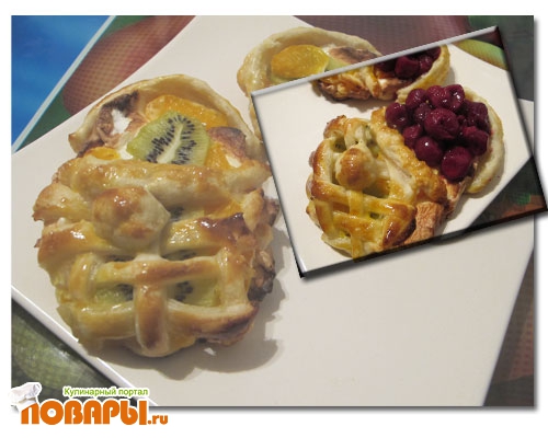 Делаем бортик из теста для задней части ступни. Формируем начинку - слой творога, яблоко, киви, вишня (предварительно нарезать тонкими ломтиками фрукты). Сверху положить сеточку из полос теста, закрывая начинку, формируя носок лаптя. Сладкий лапоть готов.