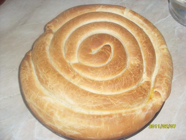 Первую "колбаску" свернуть в виде спирали, защипами внутрь и выложить в центр формы, смазанной маслом.