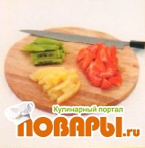 Фрукты вымыть, киви и ананас почистить, у клубники удалить плодоножку. Нарезать фрукты соломкой, клубнику разрезать на четвертинки.