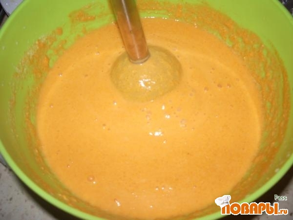 Шафран предварительно замачиваем в теплой кипяченой воде (20 -30 мл) и получается ярко желтый настой(на фото бледноватый раствор получился, в жизни насыщенней). Процеживаем и добавляем в нашу массу из тыквы и сливок.