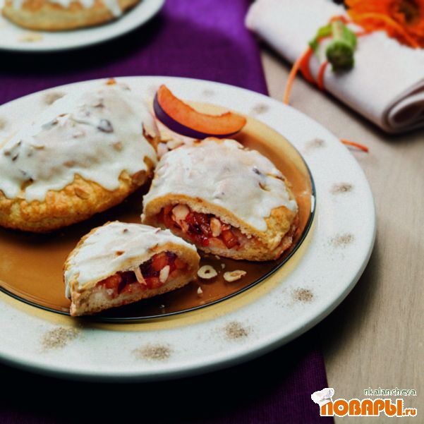 Начинка: смешать кусочки сливы с повидлом и орехами (70 гр.). Распределить на каждый кусочек теста по 1 столовой ложке наполнителя. Смазать один край теста молоком, другим закрыть половинку. Кармашки прижать по краям вилкой.