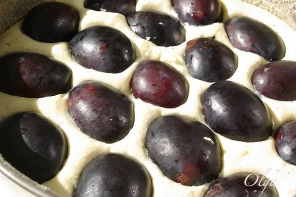 Сливы вымыть, вынуть косточки, разрезать пополам и разложить на тесте срезом вниз, посыпать сахарной пудрой.