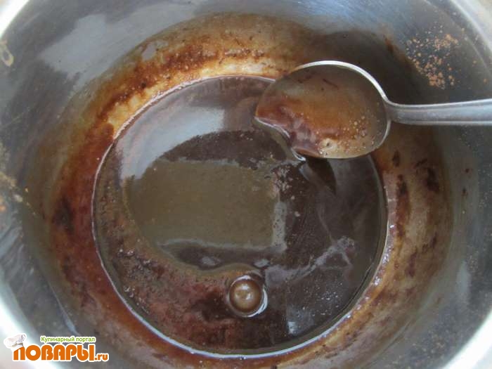 Дальше делаем глазурь: 50 гр. масла смешиваем с водой, какао порошком и сахаром. Варим минут 5, пока масса не станет однородной.