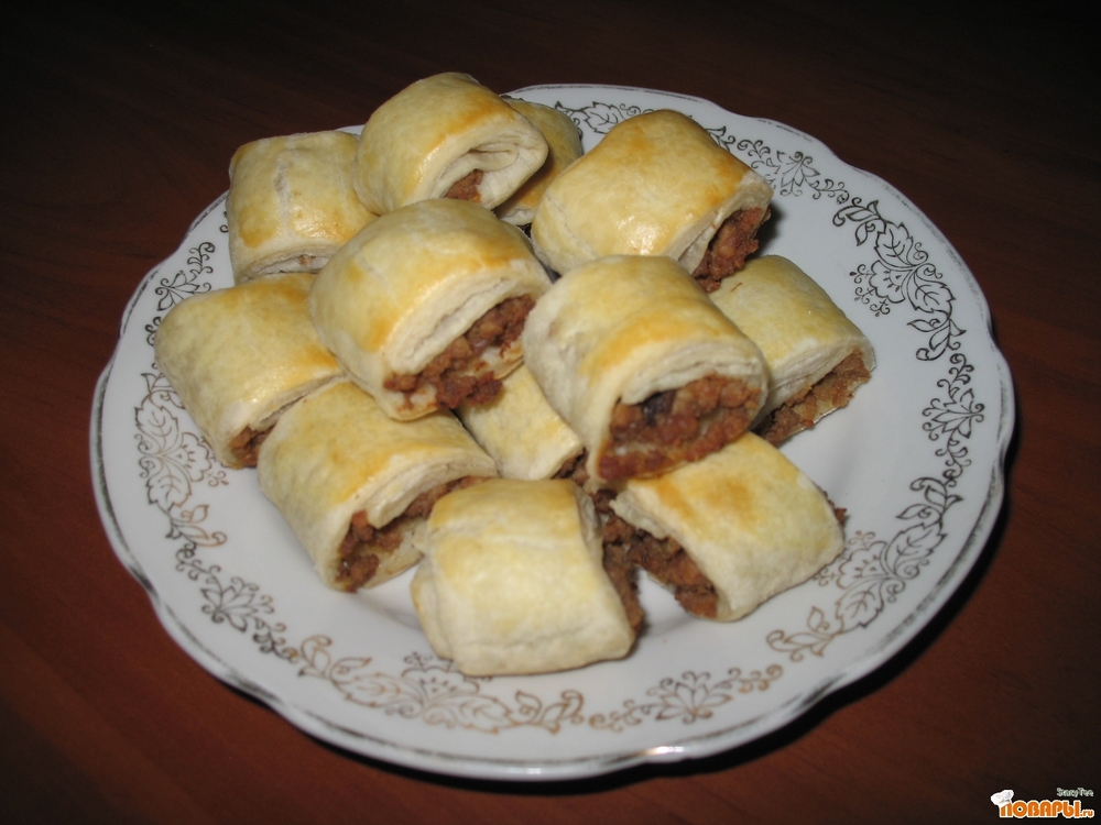 По середине уложить фарш также вертикально. Левым краем теста наркыть фарш, прижать руками, чтобы вышел воздух. Скрутить длинную полоску. Нарезать эту полоску поперек на маленькие рулетики. Смазать яйцом и по желанию посыпать сверху маком. Отправить в заранее разогретую духовку на 15-20 минут.
