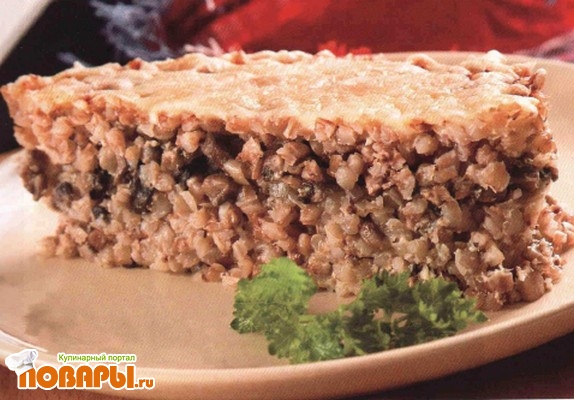 Половину готовой гречневой каши выложите в смазанную маслом форму, затем слой грибов с луком и снова оставшуюся кашу.