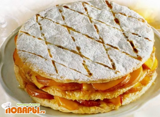 Поместите первый слоеный корж на сервировочное блюдо, выложите половину порции персиков, накройте вторым коржом и выложите оставшиеся персики. Накройте третьим слоеным коржом.