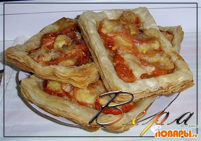 Смазать тесто горчицей, выложить дольки помидора. Сверху накрыть ломтиками сыра. Запекать около 15 минут при 200 градусах.