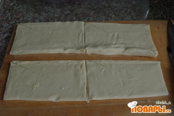 Достаем тесто из упаковки и отрезаем два "разворота" (из расчета один разворот на две слойки). Затем перерезаем каждую часть пополам: