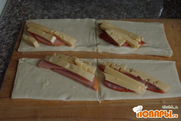 В итоге у нас получается четыре прямоугольника. Разрезаем каждый по диагонали. Сверху кладем начинку. В этот раз я пробовала самый простой вариант: сыр и колбаса.