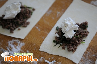 Приготовление слоёнок. Раскатываем слоенное тесто в виде большого круга. После чего ровно разрезаем, так чтобы получились квадратоподобные лепешечки размером с ладонь.