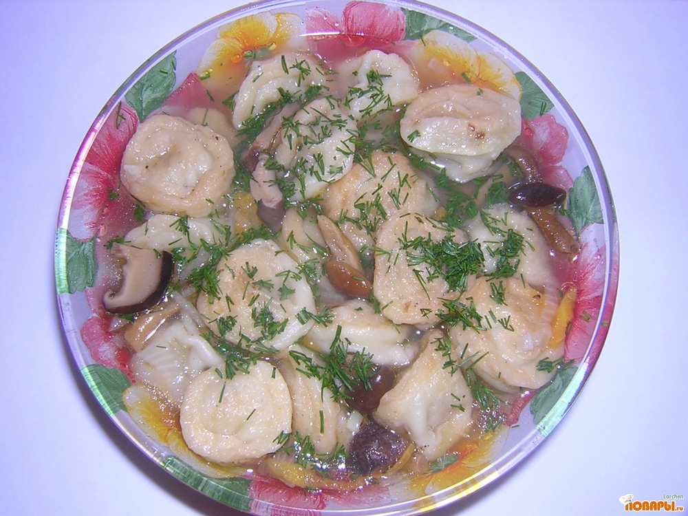 Лепим пельмешки, сырыми обжариваем на растительном масле до золотистого цвета, складываем в горшочек. Грибы режим не очень мелко, лук - полукольцами, морковь трем на терке и все это обжариваем на растительном масле. И тоже отправляем в горшочек.