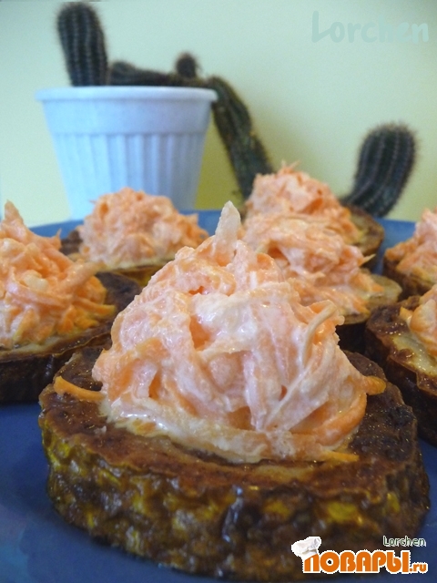 Морковь натереть, смешать с майонезом и чесноком, посолить.