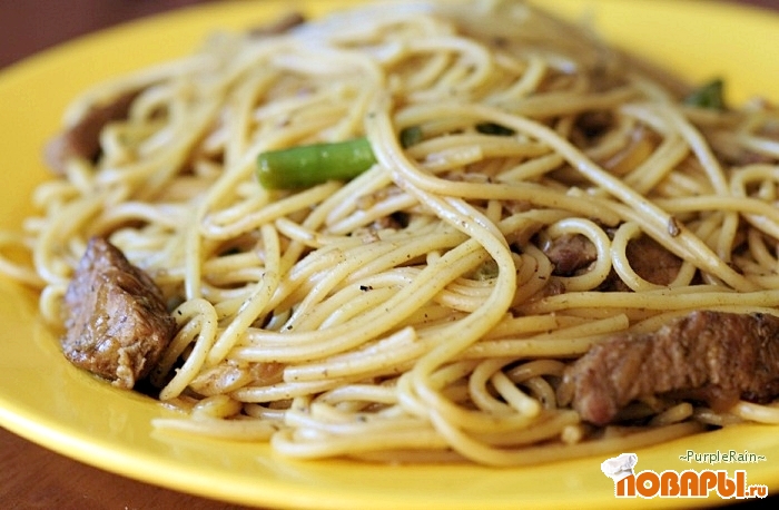 Перед тем как добавить спагетти в общее блюдо нужно мясо и стручковую фасоль посалить, добавить кардамон (5-7 штучек, молотый), базилик сухой- можно свежий мелко порубленный, куркума (ту которую путают с шафраном). Соль и перец черный по вкусу. Все хорошо перемешать.