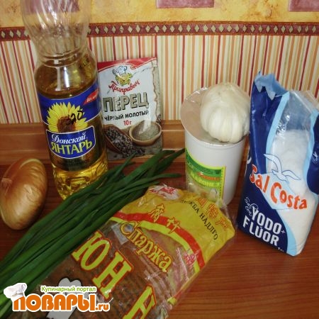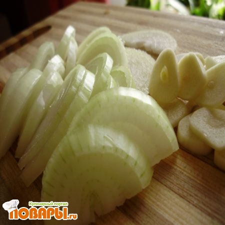 В сковородку с маслом с доски аккуратно ссыпаем нашу нарезку. Сначала даем дорогу чесночку и луку репчатому, потом (когда они подрумянятся) к ним присоединяется спаржа «Юнн».