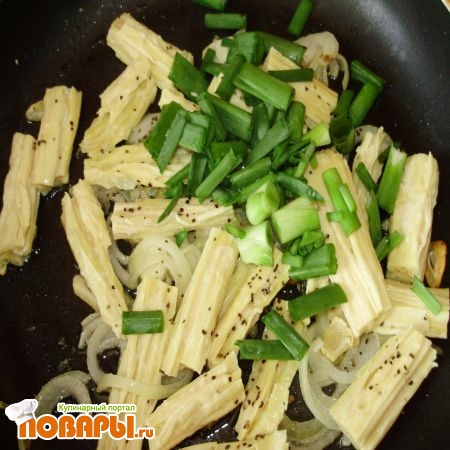 Бобовую спаржу «Юнн» (аналог мяса из сои) вымачиваем до гибкости. Свежим «соевым палочкам» (за рубежом их знают именно как «палочки») нужно меньше времени расслабляться и напитываться водой, чтобы стать съедобными. Можно определить замоченный сухой полуфабрикат на всю ночь.