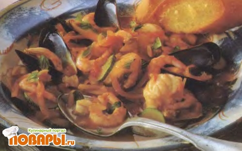 В основе этого роскошного блюда лежит классическое рыбное рагу буйабез, которое готовят на юге Франции. Можно использовать любые морепродукты, главное, чтобы их было не менее 900 г. Хрустящие чесночные тосты из белого хлеба пропитываются изысканным соусом, в котором тушились мидии, креветки, рыба и кабачки.