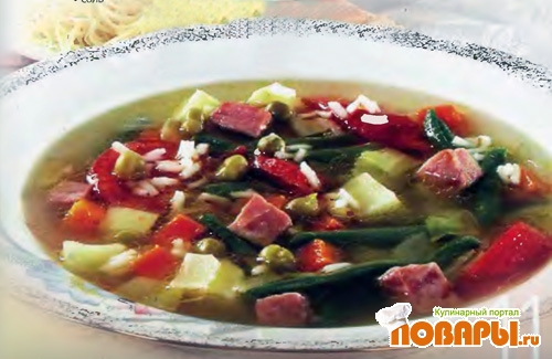 Залейте бульоном, положите очищенные от кожицы и нарезанные ломтиками помидоры, горошек, нарезанную фасоль и варите на слабом огне 10 минут.