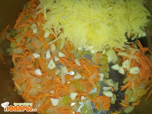 В кастрюле растопим сливочное масло и немного подсолнечного. Обжарим в ней до золотистого цвета лук с чесноком, добавим натёртую тонкой соломкой морковь, а затем картофель, тоже натёртый тонкой соломкой.