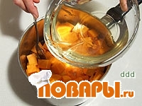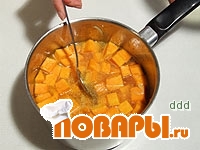 Добавьте в кастрюлю нарезанную тыкву и мелко нарезанную картошку. Залейте содержимое кастрюли таким количеством бульона, чтобы жидкость покрыла тыкву.