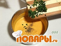 Добавьте в пюре сливки, соль, черный перец, мелко нарезанную зелень укропа и половину ветчины. Тщательно перемешайте.
