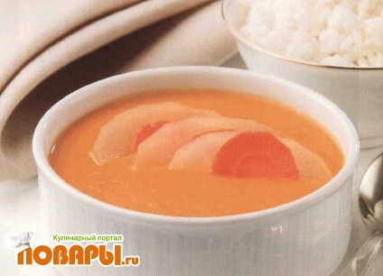 Овощи и яблоки протрите вместе с бульоном через сито или измельчите блендером, вновь доведите суп до кипения, посолите, поперчите, добавьте сахар по вкусу. Сварите рассыпчатый рис и подайте его к супу отдельно.