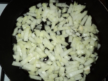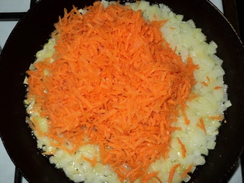 Не забываем посолить. Затем мелко режем оставшийся лук и обжариваем его на растительном масле,