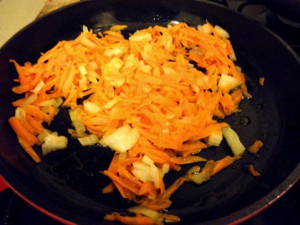 Морковь натираем на крупной терке, лук нарезаем кубиками. Все пассеруем на растительно масле, примерно 8 минут.