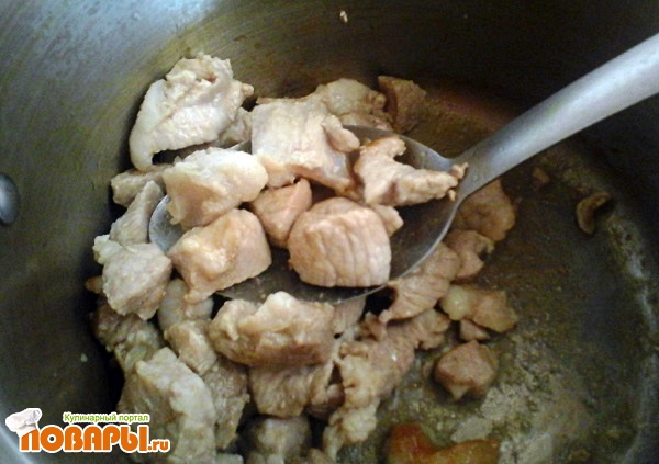 Находим кастрюльку, терпимую к обжарке мяса. Нагреваем, добавляем немного подсолнечного масла. Закидываем порезанное мясо. И жарим минут 20 на среднем огне, постоянно помешивая.