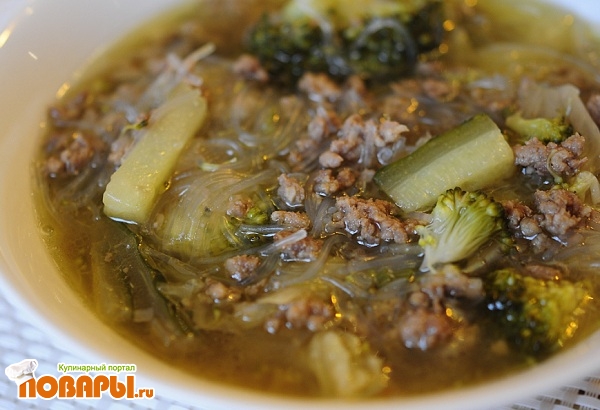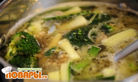 Брокколи поделить на кустики и выложить в общую кастрюлю. Добавить соль и соевый соус, перец черный. Вода закипит, варить еще минут 10 и выключить.