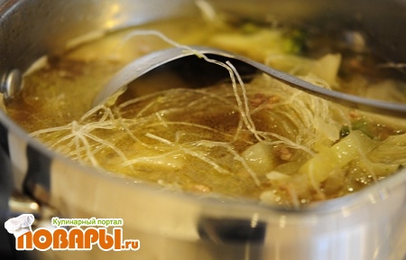 Добавить рисовою лапшу варить минуты 3 и выключить.