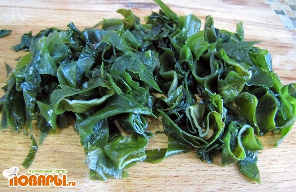 Возьмите небольшой пучок сушеной морской капусты из пачки, залейте тёплой водой. Отставьте в сторону на 10 - 15 минут. После того как капуста набухла, отожмите её и промойте под проточной водой. Нарежьте помельче.