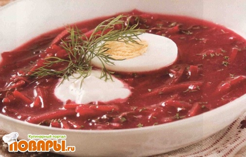 При подаче разлейте свекольник в тарелки, положите по половинке вареного яйца, оставшуюся сметану и укроп.