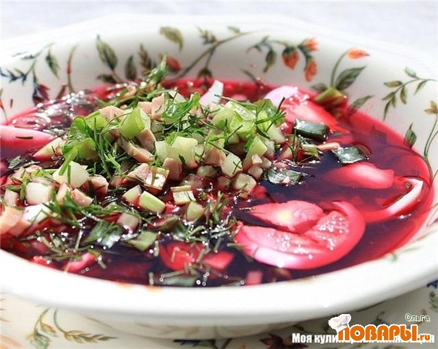 Я такой свекольник делаю немного по-другому. Свеклу беру маринованную (свма мариную), беру холодную воду бутилированную без газа или, что значительночаще,- из-под крана. У нас вода из артезианской скважины, не хлорированная, поэтому вкус блюда получается очень хороший, а в остальном- как у вас. В летний день- лучше еды нет!
