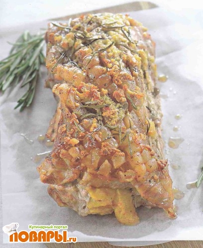 Чеснок измельчите и смешайте с маслом, розмарином, солью и перцем. Обмажьте этой смесью карбонад.