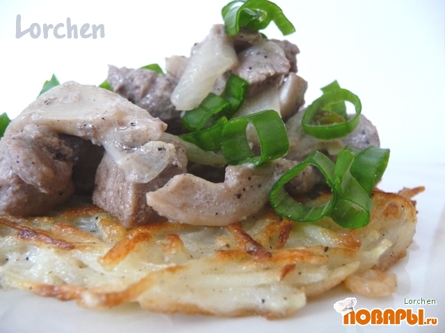 Готовый картофельный блин выкладываем на тарелку, сверху - свинину с грибами. Украшаем зеленью.